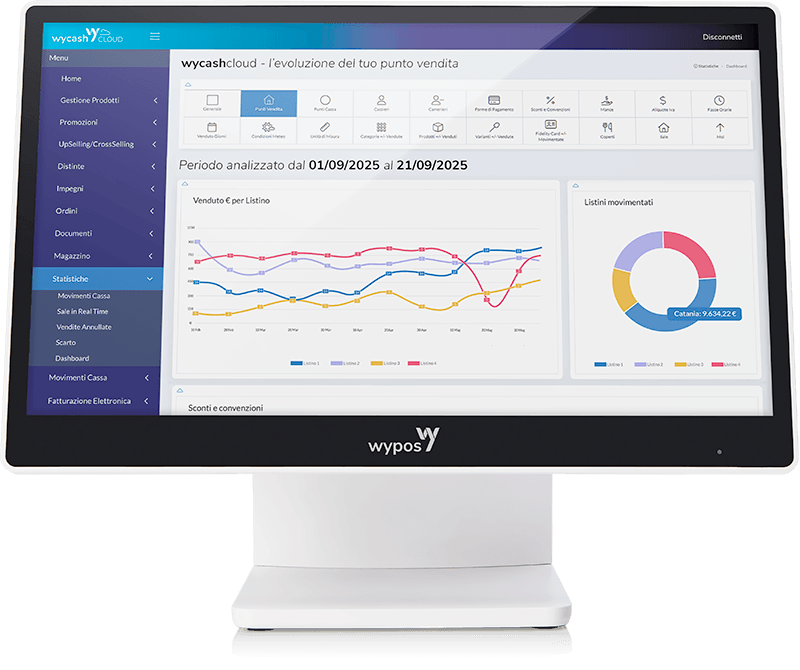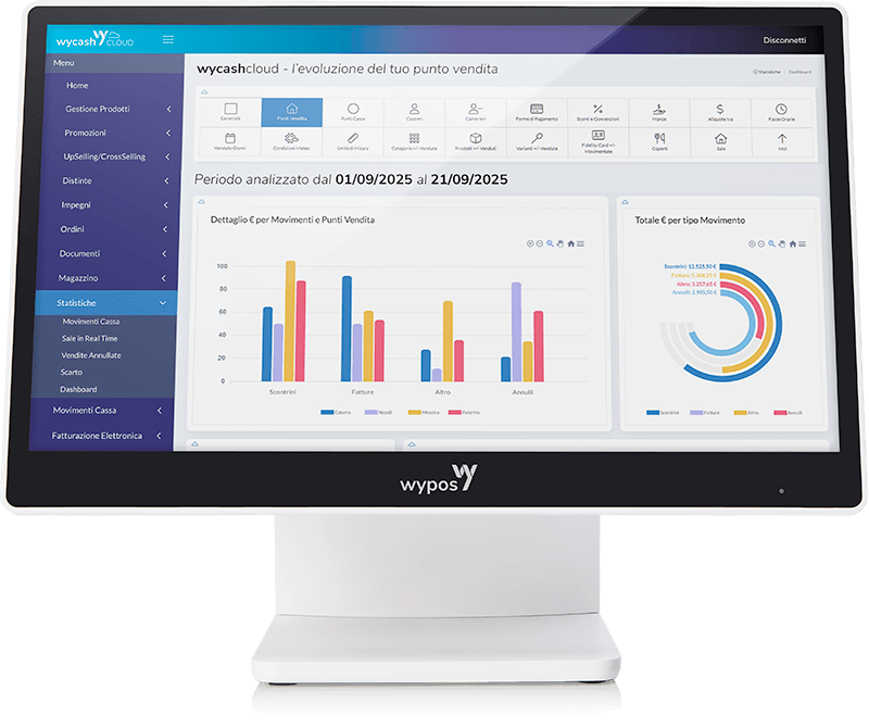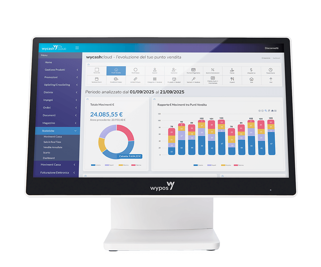 Wycash Cloud è il software flessibile e modulare, perfetto per gestire simultaneamente un numero illimitato di punti cassa e punti vendita da un’unica piattaforma. Accedendo al portale web dedicato puoi configurare e monitorare tutti i punti cassa di ogni punto vendita, analizzare le vendite e organizzare al meglio la tua attività, da qualsiasi dispositivo connesso a internet.