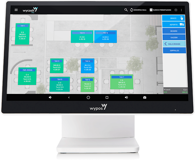 Inoltre l’innovativa modalità di gestione delle sale e dei tavoli consente di caricare fotografie o piante del tuo locale e personalizzare la posizione dei tavoli, condividendola con i palmari per la presa delle comande. In questo modo puoi monitorare costantemente lo stato della sala e fornire al tuo personale un valido strumento per offrire un servizio ancora più rapido ed efficiente.